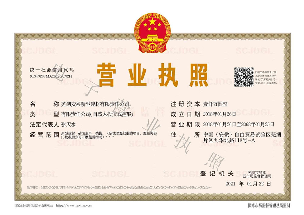 - 蕪湖安興新型建材有限責(zé)任公司是一家專(zhuān)業(yè)生產(chǎn)干混砂漿建筑材料的新型企業(yè),成立于2018年1月,公司位于中國(guó)(安徽)自由貿(mào)易試驗(yàn)區(qū)蕪湖灣里工業(yè)園,專(zhuān)業(yè)從事干混砌筑砂漿、干混抹灰砂漿、干混地面砂漿、混凝土外加劑的及配套材料的研發(fā)生產(chǎn)與銷(xiāo)售。公司前身上海四虎建材成立于2005年,于2018在蕪湖成立安興新型建材,辛勤發(fā)展至今,已全部采用全自動(dòng)生產(chǎn)線(xiàn),擁有強(qiáng)大的供貨能力。公司成立十多年來(lái),一直專(zhuān)注于干粉砂漿...